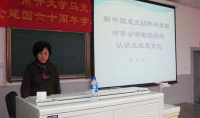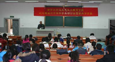 随后,“庆祝新中国成立六十年周年学术研讨会”正式开始。来自我院的8位论文作者依次进行了学术报告,他们分别是张健:《从社会主义到中国特色社会主义》、武东生:《论马克思的意识形态观》、丁军:《建国以来我国高校思想政治理论课发展的回顾与思考》、季健霞《建国以来党对社会主义本质理论认识的发展和深化》、赵美玲:《新中国成立60年来我国对非公有制经济的认识及政策变化》、祖金玉:《建国以来中国共产党党内民主发展脉络及其启示》、高辉:《建国以来中国对联合国的认识及行动选择》、尹倩:《始终不渝走和平发展道路》。学术报告内容丰富、主题鲜明、语言生动,在座的师生受益颇深。