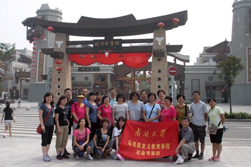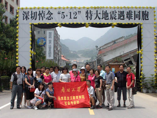 为纪念“5·12”汶川地震三周年,深入学习抗震救灾精神实质,丰富和提高思想政治理论课教师的实践经历和业务水平,按照教育部和天津教委关于组织高校思想政治理论课教师进行假期社会考察的要求, 713-19日,马克思主义教育学院组织教师社会考察团赴四川省北川县和都江堰地震灾区考察调研地震遗址及灾后恢复重建情况。在为期六天的考察时间里,考察团先赴四川省北川县老县城参观地震废墟纪念馆并祭奠在“5·12”地震中遇难的同胞,随后赴北川新县城和都江堰城乡进行灾区重建和社会发展情况调研。