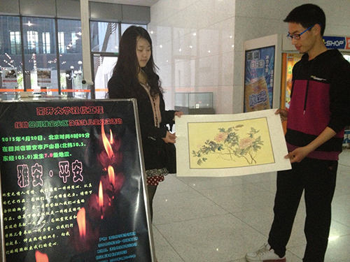在活动开展中,多位老师同学都称赞了此次义卖的形式新颖,十分有意义。同时,活动负责人也接受了英国上市公司365电视台的采访,介绍了活动情况,并为雅安祝福祈祷。本次活动中购买作品捐款的人不仅有本校学生,还有老师和外校来南开考博的学生;让人感动的是,一些捐款者以高价买作品,是为了能为灾区多送去一点心意。
