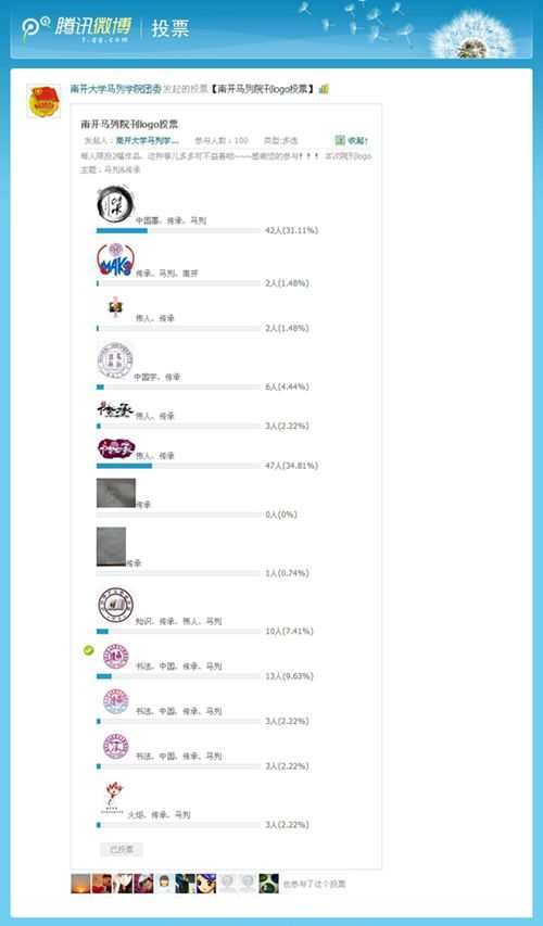 历时半个月的《传承》院刊LOGO设计比赛共收到学院学生12件作品,作品各具特色、各显风采,其中6件为个人参赛作品,6件为宿舍成员共同完成。在投票阶段,学院100余名老师、学生积极参与,最终《伟人 传承》以47票位居榜首,《中国墨 传承 马列》以43票位居第二。学院《传承》院刊编辑部将根据投票结果确定院刊正式LOGO。