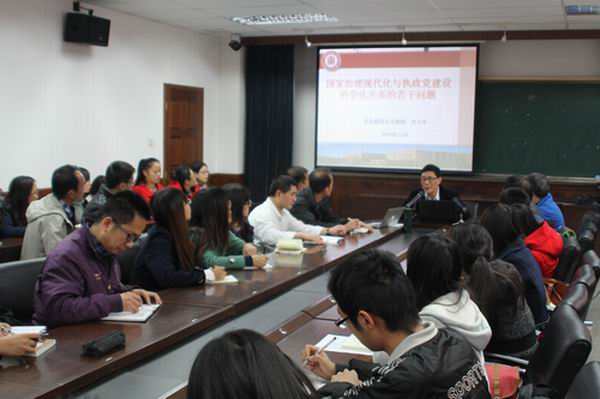 齐卫平教授长期从事中共党史党建研究,现担任华东师范大学政治学系系主任一职,兼任全国中共党史学会理事、中共上海市党史学会副会长、中共上海市委党史研究室特约研究员等职务。此次讲座齐教授结合刚刚结束的十八届四中全会的主要精神,围绕关于国家治理现代化与执政党建设科学化关系谈了自己对8个问题的理解,即:如何理解国家治理现代化;国家治理现代化进程中如何正确处理国家、政党、社会三者关系;如何定位政党在国家治理现代化体系中的角色;国家治理能力与党的执政能力是什么关系;怎样认识党的领导与依法治国的统一;国家治理现代化的中国特色与政党制度的中国特色有什么关联;现代国家治理对执政党建设提出的要求是什么。