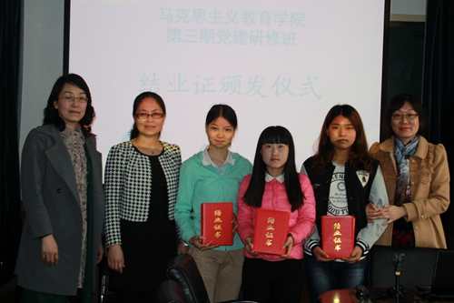 活动伊始,党建研修班的培训部部长就研修班的性质、职能、部门、考核方式等具体情况进行了详细的介绍,指出党建研修班作为学院的一个品牌和特色,致力于加强对入党积极分子的培养教育,已经为党组织选拔和输送了一批又一批的优秀人才。在回顾了上一期党建研修班的开展情况、学习成果和实践风采之后,举行了第三期党建研修班结业证书颁发仪式,以及聘请张长虹为党建研修班指导老师的致聘仪式。