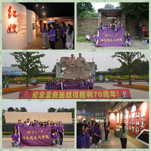 在临沂,马院师生先后来到华东革命烈士陵园、红嫂纪念馆、孟良崮纪念馆和大青山突围纪念馆进行参观和走访,实地体验红色文化内涵。在革命烈士陵园的纪念碑下,2016级本科生班团支书张隽娅带领大家面对团旗重温入团誓词,她谈到,今日在此庄严宣誓,不仅是对革命烈士精神的宣扬,更是激励共青团员传承先烈的精神,吃苦在前,享受在后,为社会多做贡献。一幅幅图片、一件件文物让实践队员深刻感受到了沂蒙山区百姓对革命的支持,沂蒙母亲王换于、沂蒙红嫂明德英、沂蒙六姐妹,她们爱党爱军、无私奉献的精彩篇章让队员们感到沂蒙精神的伟大。在孟良崮战役中架起的“火线桥”、在大青山突围站牺牲的抗大学员……都深深印刻在实践成员的脑海中。“最后一块布,做军装;最后一口饭,做军粮;最后一个儿子,送战场。”这是实践队行走在沂蒙老区,听到的最多的一句话。