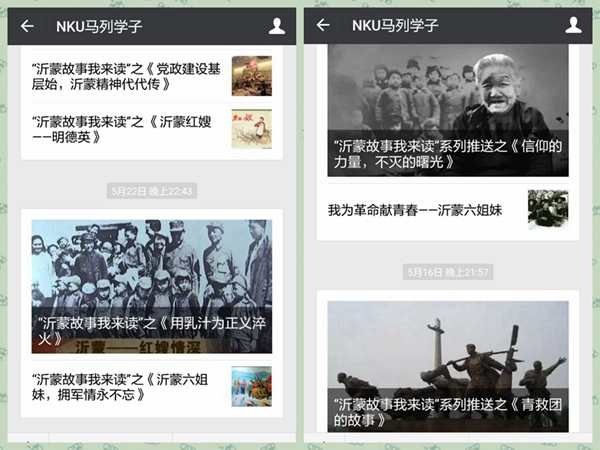 5月11日-25日,马院实践队依托“NKU马列学子”微信平台,开展“沂蒙故事 我来读”专题活动,陆续选编推出“沂蒙六姐妹”、“血战孟良崮”、“沂蒙红嫂—明德英”等近20篇沂蒙小故事,同学们结合故事畅谈读后感想。沂蒙故事选编推送旨在通过宣读革命故事,教育学生铭记革命传统,传承沂蒙精神。