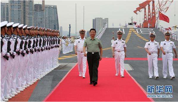 中共中央总书记、国家主席、中央军委主席习近平在出席十二届全运会开幕式前夕,专门视察沈阳战区部队。2013年8月28日下午,中共中央总书记、国家主席、中央军委主席习近平检阅辽宁舰水兵仪仗队。李刚摄