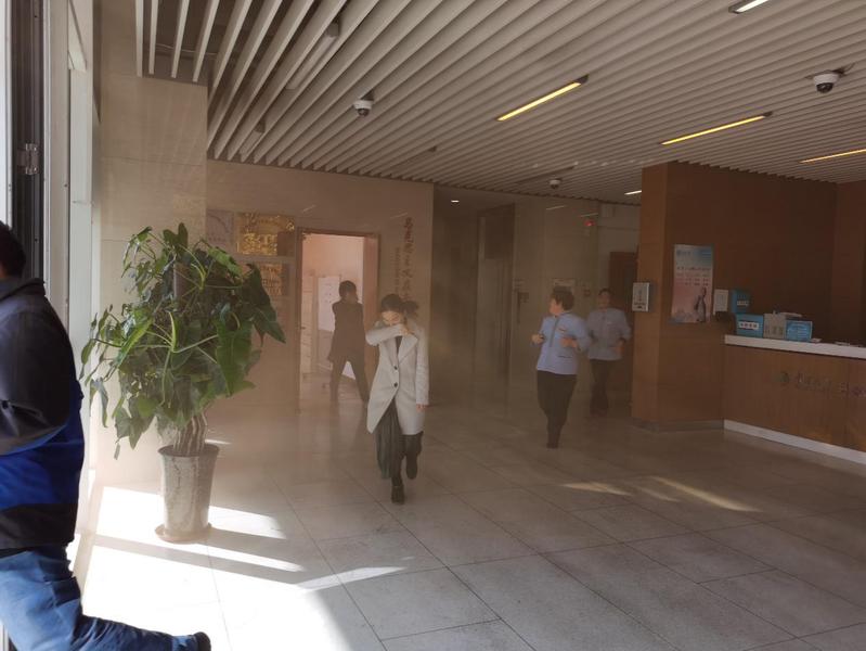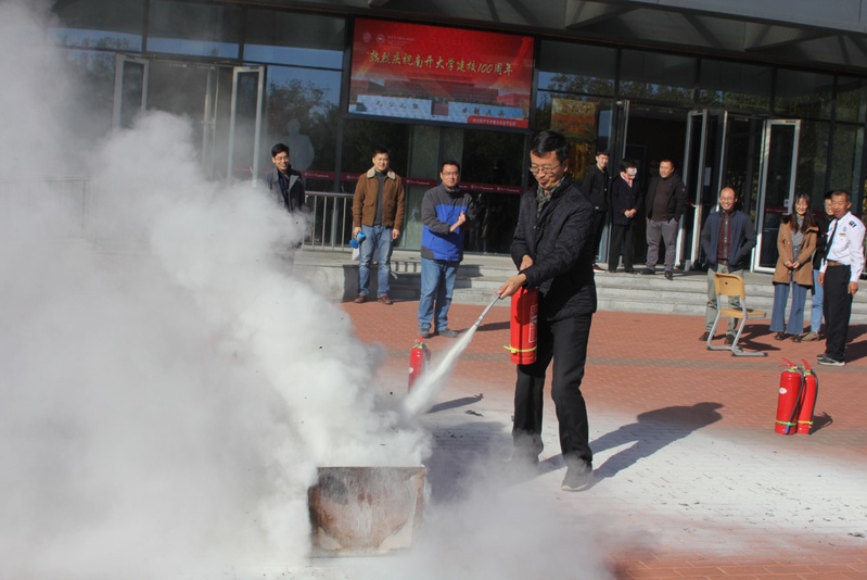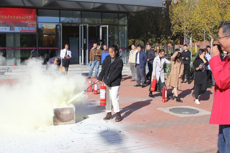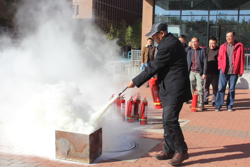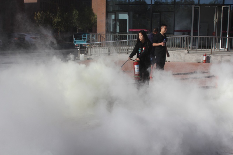 为了营造更加贴近实际的效果,学院楼里警铃拉响,现场施放了仿真烟雾。在学院楼前,保卫处张琪详细介绍了消防安全演练的重要性,演示了灭火器材的使用详细过程,并指导师生开展实战演练。
