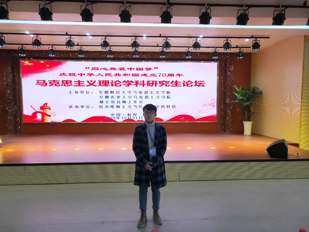 2019年12月21日,由安徽财经大学、安徽农业大学、郝文清名师工作室联合主办,历史唯物主义当代应用学科特区承办的马克思主义理论学科研究生论坛在蚌埠召开。来自中央党校、北京大学、东南大学、武汉大学以及英国上市公司365等全国高校及人民出版社、中共淮北市委等单位的专家学者及青年学生参会。我院硕士研究生赵赟受邀参会,并受委托代表所属的分论坛进行总结发言。