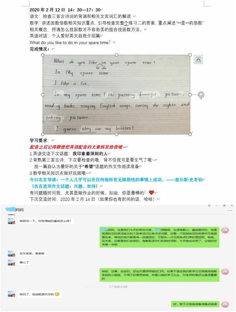 疫情发生后,她积极报名青春战“疫”公益活动,积极为一线医生的孩子进行一对一家教辅导,她牢记志愿初心,认真辅导、耐心记录,和家长积极交流学习情况,切实解决一线医务人员的后顾之忧。