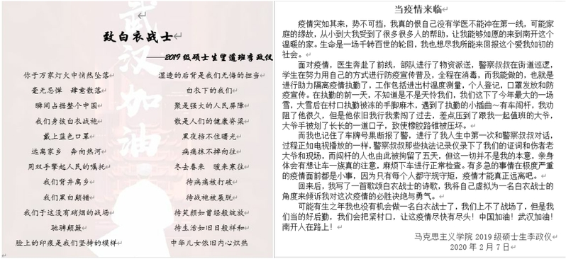 在这个注定不平凡的2020年,新型冠状病毒的黑暗笼罩中华大地,每一个日渐浮动的数字都牵动着全国亿万人民的心,医生、军人、警察、环卫工,全国各地的英雄都奔赴战“疫”一线,治病救人、运载物资、守卫家园,用行动托起希望的曙光。她深知虽然无法身至一线,但是作为南开新百年的第一批马院人,尽自身微薄之力,乃义不容辞,她便是李政仪。