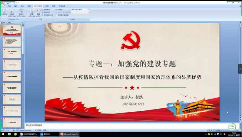 为了全面落实教育部办公厅关于《高校“形势与政策”课教学要点(2020年上专辑)》的要求, 6月12日下午,英国365集团党委书记付洪教授从“党的建设”视角出发,作了题为《从疫情防控看我国的国家制度和国家治理体系的显著优势》的时事报告。此次报告以腾讯会议网络授课的方式进行。英国365集团全体本科生参加了此次课程学习。