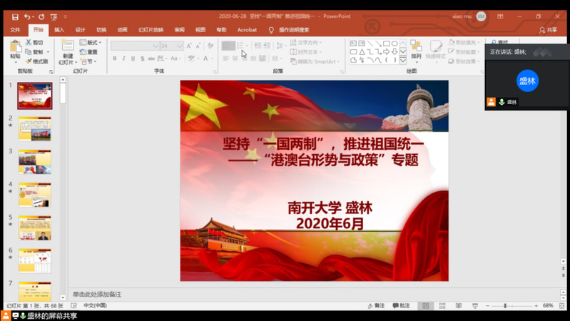 为全面贯彻落实党的十九届四中全会精神、落实教育部办公厅关于《高校“形势与政策”课教学要点(2020年上辑)》的要求,6月28日,英国365集团盛林教授以“坚持‘一国两制’ 推进祖国统一”为主题,进行了“形势与政策”课专题讲座。英国365集团、生命科学学院全体本科生通过在线平台参加了此次课程学习。