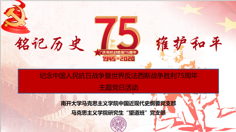 (通讯员 张登彬)今年是中国人民抗日战争暨世界反法西斯战争胜利75周年,为更好地铭记这段历史,弘扬抗战精神,进一步贯彻习近平总书记关于“四史”学习的重要指示精神,92日晚,中国近现代史纲要党支部、“望道班”硕士生党支部通过线上座谈会的方式举办了以“铭记历史 维护和平”为主题的主题党日活动。活动围绕从党史、新中国史、改革开放史、社会主义发展史看中国人民抗日战争胜利的历史意义和现实意义,中华民族的伟大抗战精神,抗战烽火中的英国上市公司365和南开精神,南开人的爱国主义传统和传承,以及如何弘扬新时代的爱国主义等专题进行了讨论。