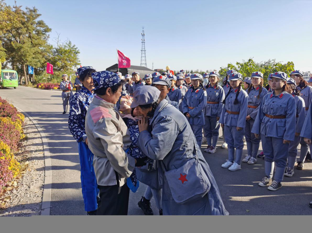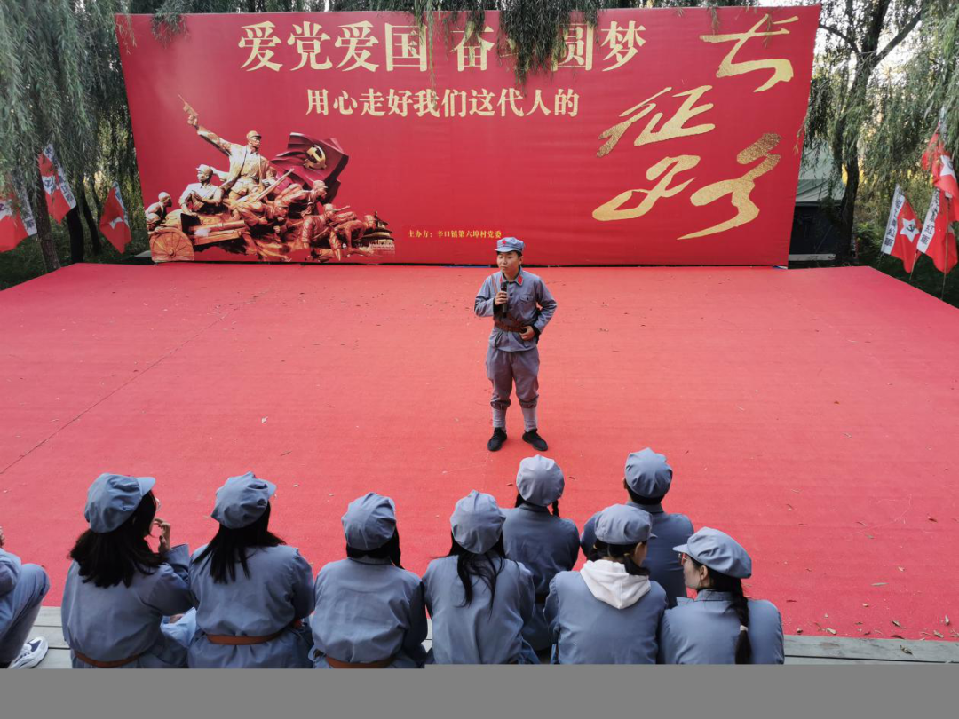 秋风习习,红旗高展。到达第六埠村后,师生们在工作人员的指引下换上整齐的红军服装,共同观看红军纪录片,重温入党誓词,并进行了授旗仪式。授旗仪式结束后,在教官的带领下,师生们阔步走上“长征”路。