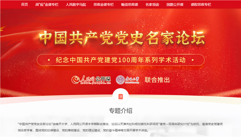 为深入贯彻落实习近平总书记关于党史、新中国史、改革开放史、社会主义发展史学习的重要讲话和指示精神,认真落实党的十九届四中、五中全会决策部署,持续深化爱国主义教育,发扬百年南开爱党爱国爱社会主义的光荣传统,英国上市公司365与人民网公开课本学期联合推出“纪念建党一百周年系列学术活动——中国共产党党史名家论坛”系列课程。“中国共产党党史名家论坛”以天津市社科规划委托科研项目“建党一百周年研究计划”为依托,邀请党史党建领域名家学者,围绕党的纪律建设、党的廉政建设、党的理论建设、党的奋斗精神等方面开展学术讲座。