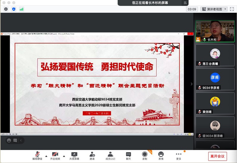 27日晚,学院2020级硕士生新民班党支部联合西安交通大学能源与动力工程学院硕士生9034班党支部线上举办“弘扬爱国传统,勇担时代使命”主题党日活动,共同学习“联大精神”和“西迁精神”,厚植学生党员爱国情怀,强化学生党员责任担当。学院党委专职组织员殴喜乐、新民班党支部党建指导员董旭东、交大能动学院团委书记雷驰与两支部全体党员参会,新民班党支部书记张登彬主持。