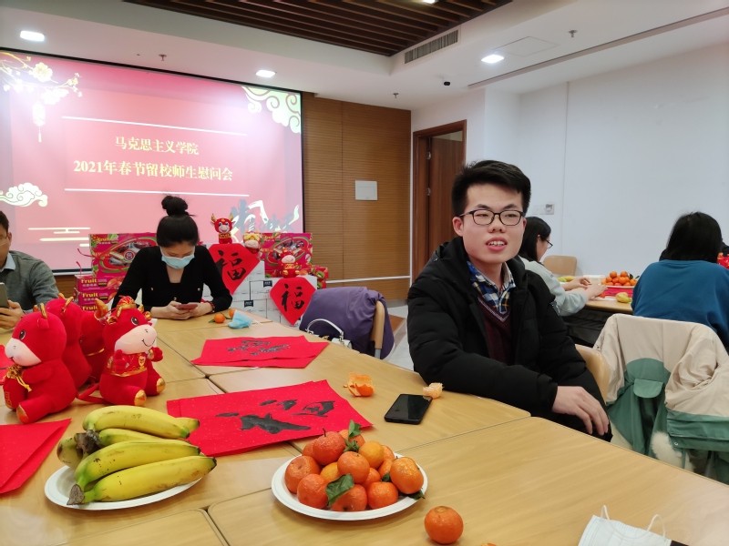 留校师生纷纷表达了对学院的感谢,并分享了自己的留校生活情况。大一学生高海洋讲到,“有爱的地方就是家,马院就是家” 。博士生黄超讲到“只要在中国,哪里都是家” 。姚金桃、王惠惠、李晓瞳、路涵旭、张志强、舒高磊等留校生,分别表示要充分利用春节假期做好学术科研、备战就业等。