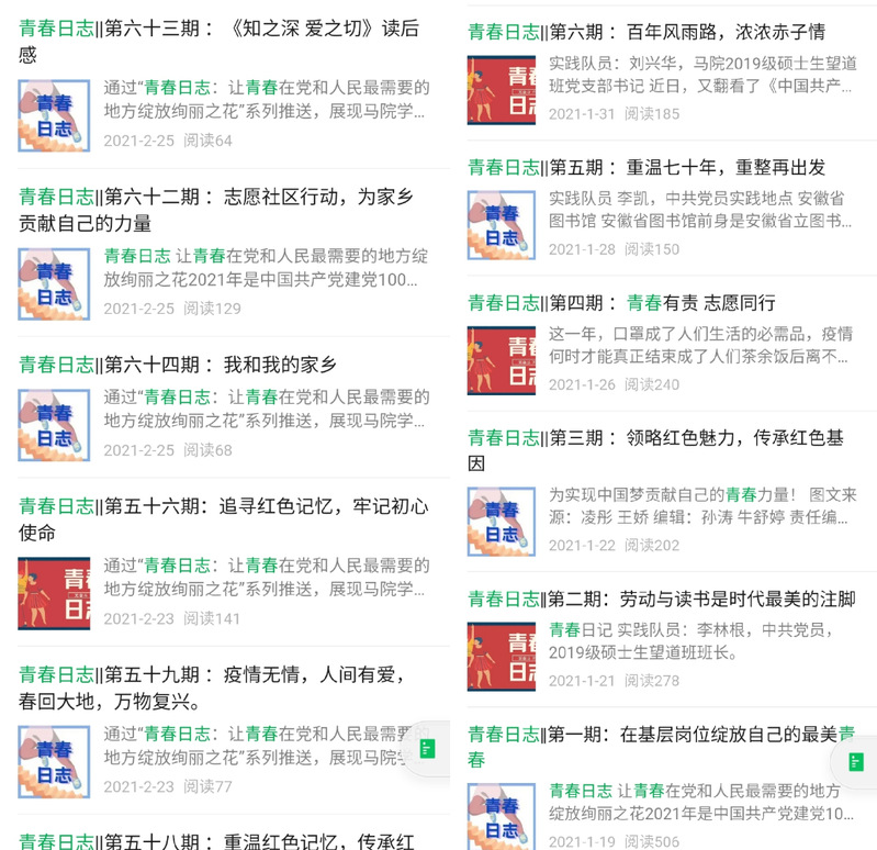 寒假期间,马院学子积极完成《共产党宣言》《党领导的强大体制对中国意味着什么》《习近平的七年知青岁月》等十余本著作文摘的阅读,通过慢阅读和静思考,深化对马恩著作、党史知识的汲取,提升专业知识储备。同时,立足家乡附近,先后从中华优秀传统文化、农业生产生活以及十八大以来家乡新变化等角度,开展社会调研工作,详细了解家乡脱贫致富以及乡村振兴规划等内容,进一步体会党带领中国人民的奋斗之路。同时,面向全体本科生开展“学术实践”活动,引导低年级学生将理论与实践相结合,不断提升学术写作能力,引导学生将论文写在中国大地上,已收稿近百篇。
