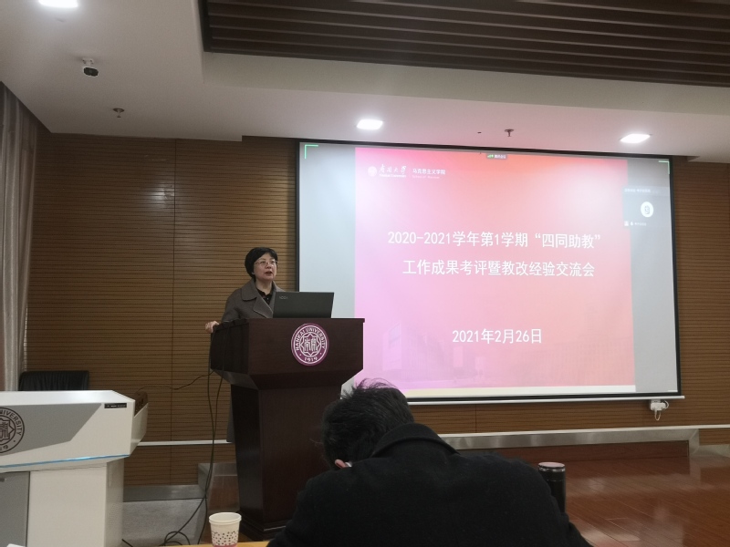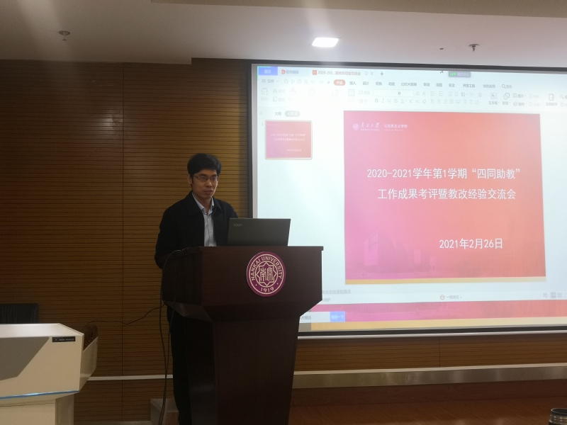 为贯彻学校《推动新时代思想政治理论课高质量发展的规定》,进一步完善“师生四同(同学同研同讲同行)”育人模式,推进思政课改革创新和提高思政课后备师资人才培养质量,2月26日,我院召开2020-2021第一学期“四同助教”成果考评暨教改经验交流会。部分学院教学指导委员会成员、上学期“四同助教”设岗教师及“四同助教”研究生通过线上线下方式同步参加。学院党委书记付洪教授主持会议。