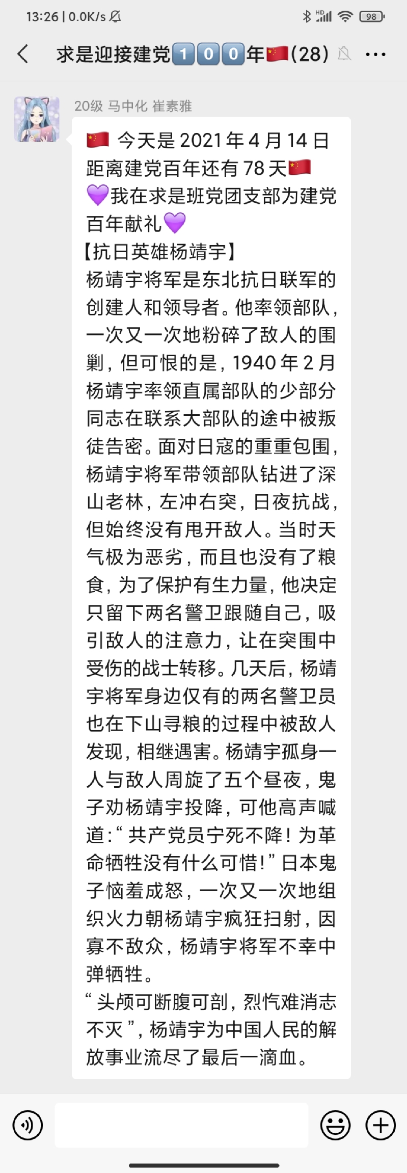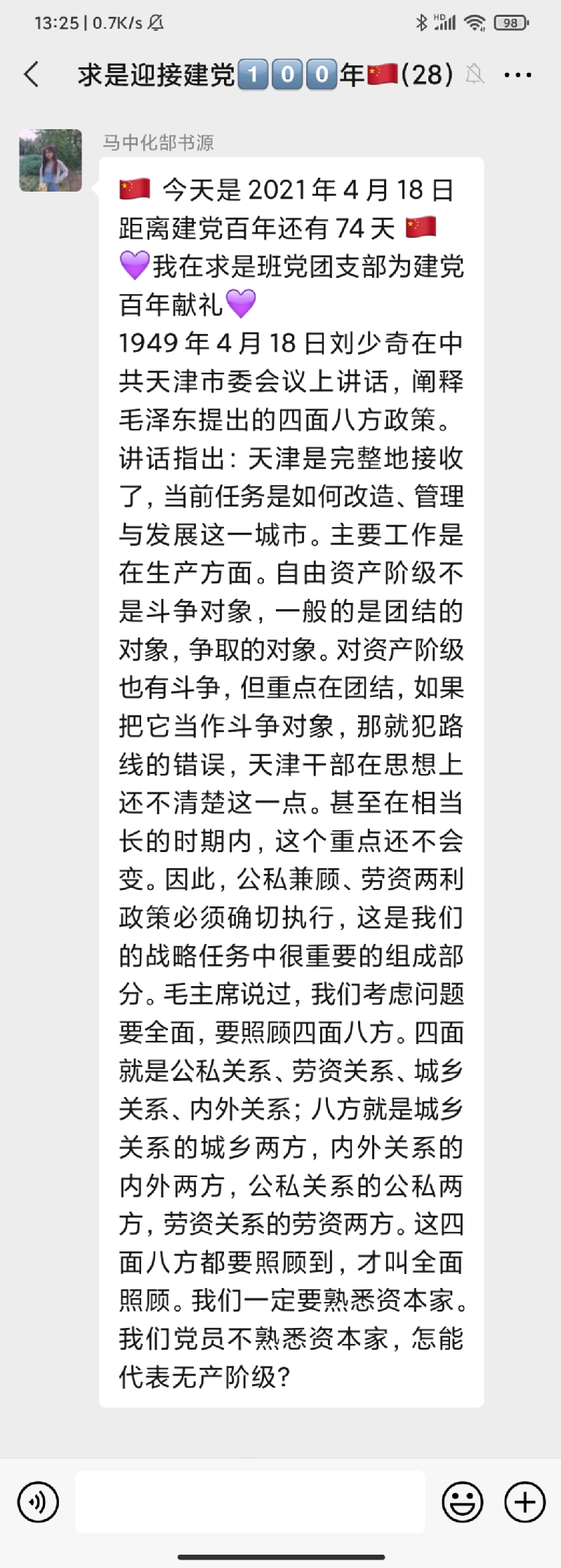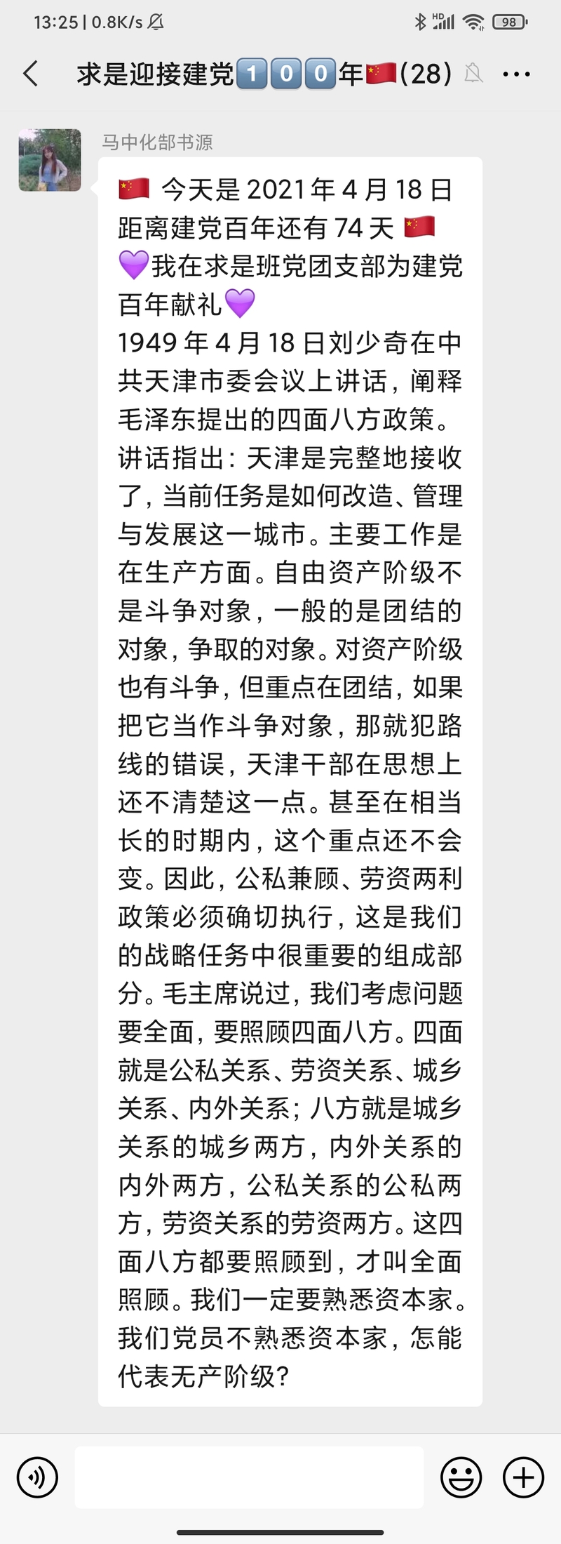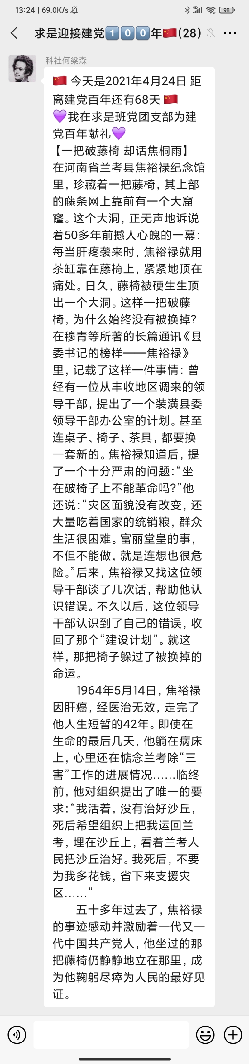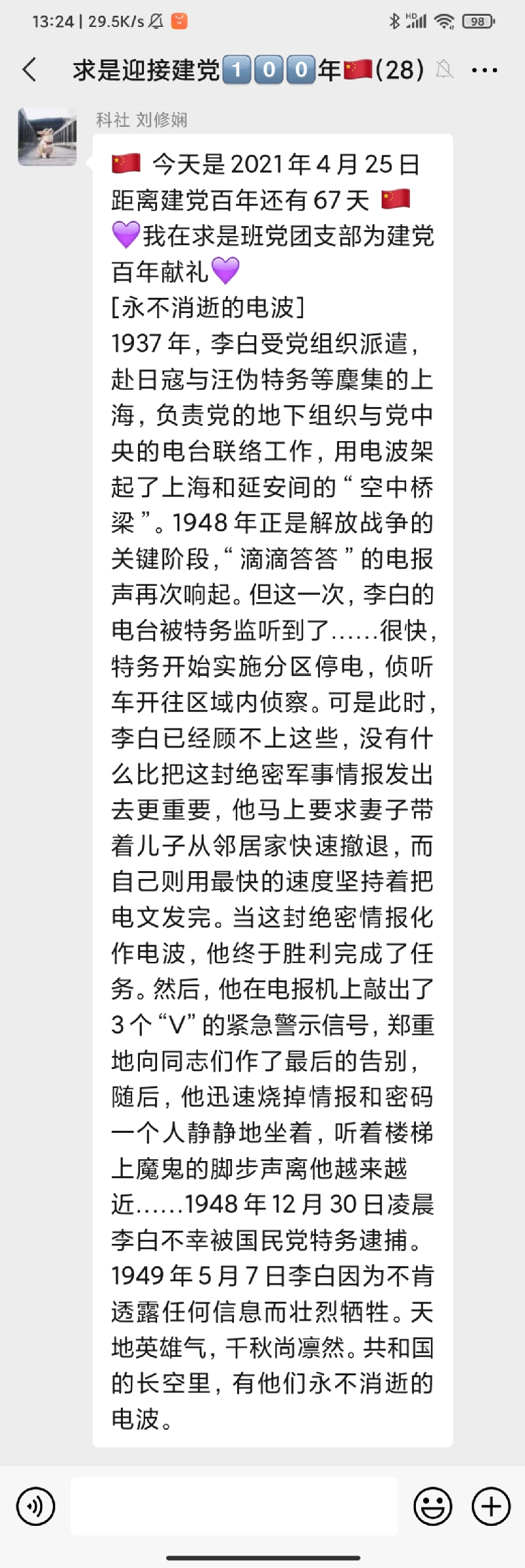 该活动自323日开展以来持续稳步推进,在求是班党团支部中引发了热烈反响,同学们表示,阅读每天的党史故事分享已经成为了睡前“必修课”。学习党史,不仅增强了同学们的知识储备,更让各位党员、团员同志了解了前辈的革命精神。求是班团支部成员付曙曦分享“邓小平在大别山区过新春”故事,让同志们进一步认识了共产党员联系群众的优秀作风。