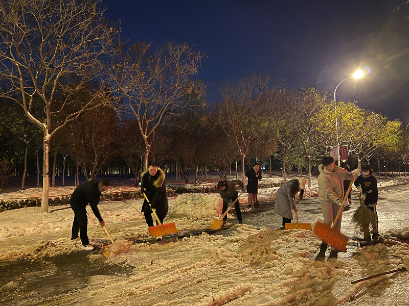 恰逢立冬,大雪骤至。初雪为大家带来惊喜与美景的同时,也给全校师生的出行带来了极大不便。为尽快扫除积雪、畅通道路、消除隐患,切实发挥党支部战斗堡垒作用和党员先锋模范作用,11月7日晚,2021级硕士生望志班党支部组织党员、团员于一食堂东侧、文科组团宿舍楼周边及英国365集团楼前的主干道开展积雪清扫志愿服务活动。