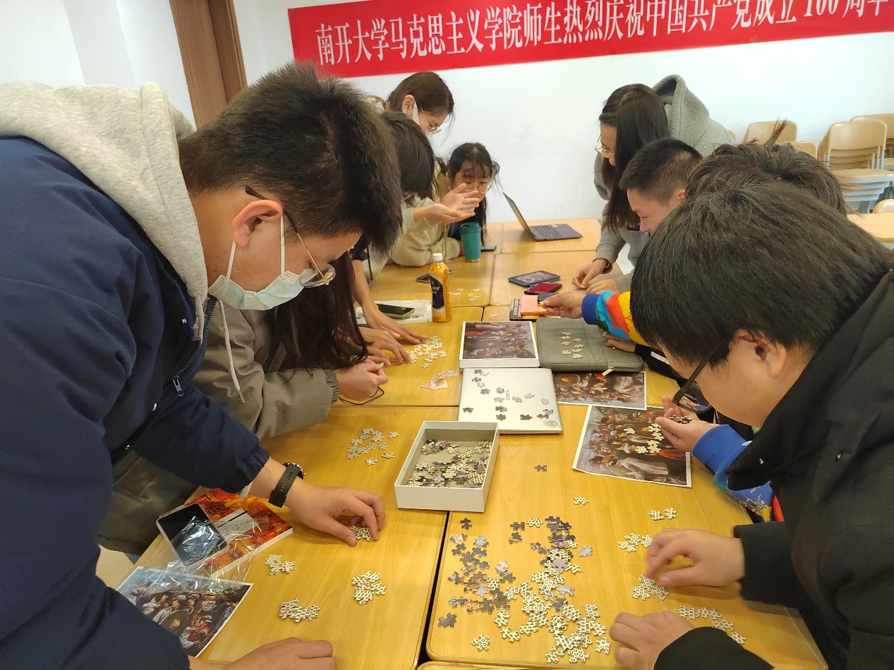 拼图由红色题材油画定制而成。团小组拿到各自的拼图后,开始了紧张而有序的拼图环节,团小组成员合理分工、相互合作。“四次方程”团小组首先完成拼图,用时35分钟。先完成的团小组成员积极帮助其他团小组。经过一个多小时,各小组均完成了拼图任务。每个团小组派出一名同学讲述拼图反映的历史事件或历史主题,大家在同学们的讲述中回顾了“一二·九”学生运动、遵义会议的红色历史,重温了长征、抗日战争反映的革命精神,感悟了军民鱼水情。