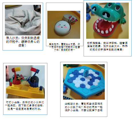 3.休闲区:有榻榻米和摇摇椅等可以休息聊天或者读书的地方,在小茶桌上还有很多小玩具,例如解药包子和咬手指鳄鱼,大家可以在这里和同学一起玩游戏,放松自己。希望各种别出心裁的设施和墙上设计,可以让大家尽情娱乐,在忙碌紧张的学习生活之余,享受一段安逸、快乐的时光。