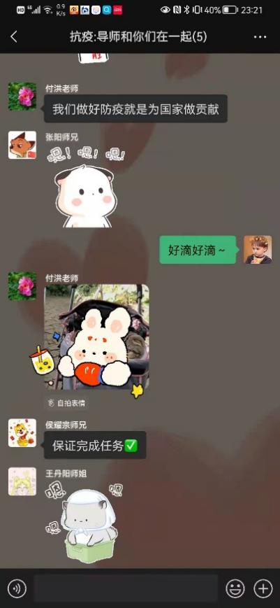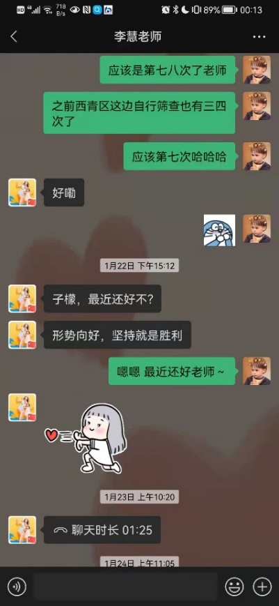 110日,社区全员阴性的核酸结果让一颗颗惴惴不安的心稍加平静,由于居住条件不便,我搬离到西青区一家酒店暂住。入住的第一晚,我久久难以入眠,无数问题伴随着消极情绪在我脑中闪过,伴着忧虑与孤单涌上心头,思乡之情也泛上眉梢。第二天我主动联系了辅导员李慧老师,李老师将疫情防控的注意事项一一嘱托,并耐心安抚我的情绪,“我的手机24小时都开机,有什么事情随时联系我”是她的真诚付出;导师付洪老师的在线陪伴更是驱逐了我漫漫长夜里的孤独,让我有了坚持下去的信心与勇气。《抗疫:导师和你们在一起》的微信群记录了付老师和我们共同坚守的全过程,承载了她对我们的深切关爱;一篇名为《孩子别怕,导师有话和你说》的深夜寄语驱散了孤独心灵的阴霾。其中,付老师说的三句话我一直铭记在心:一是坚定必胜信心;二是安排好特殊时期的学习和生活;三是在与疫情的战斗中锻炼成长。从彷徨到坚定,这三句话成为我校准自身成长进步的“定盘星”,也是我在这场战“疫”中突破自我的第一步。