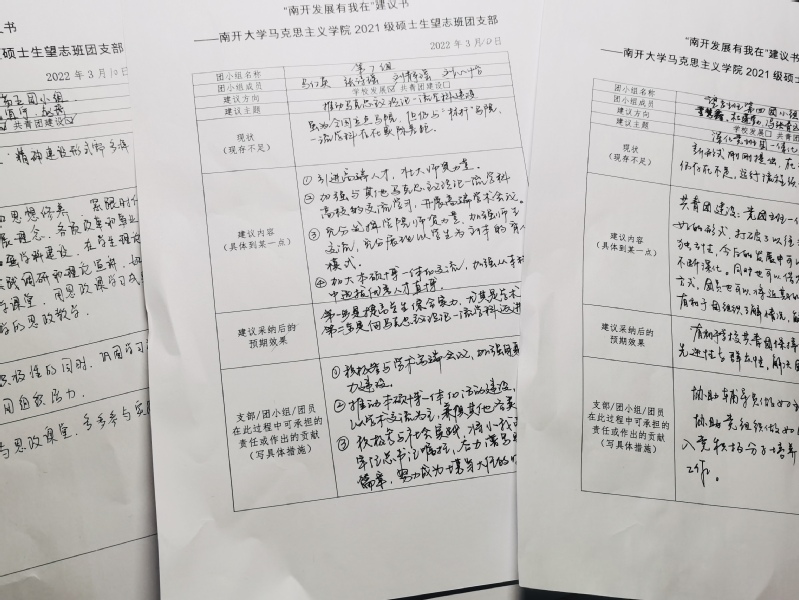 随后,团员们共同填写“南开发展有我在”建言书,从专业培养、校园文化、后勤服务、党团班一体化建设等多个方面积极为学校发展、共青团建设建言献策。团员们纷纷表示,要积极响应号召,带头学习会议精神,勇于担当责任使命,勤学苦读,立公增能,以实际行动回应“南开发展有我在”的号召,为奋力谱写南开品格、中国特色、世界一流大学内涵式高质量发展新篇章做出自己的贡献。