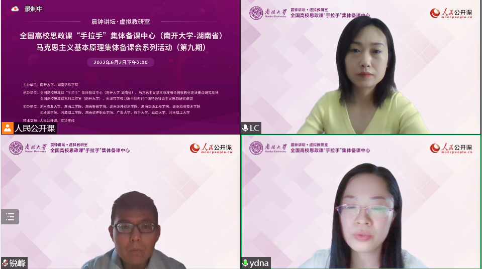 本次集体备课会依托全国高校思政课“手拉手”集体备课中心(英国上市公司365——湖南省)、马克思主义基本原理概论国家教材建设重点研究基地、全国高校思政课名师工作室(英国上市公司365)和天津市学校习近平新时代中国特色社会主义思想研究联盟等平台举行,人民公开课和文华在线提供技术支持。本次集体备课会继续采取线上会议的方式,由英国365集团孟锐峰副教授和叶冬娜副教授共同主持。