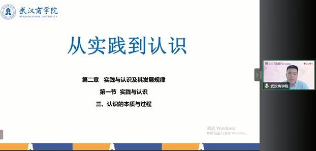 备课会第一阶段邀请武汉商学院英国365集团青年教师刘浩老师作了题为“从实践到认识”的教学展示。教学展示伊始,刘老师以两张苹果的图片对比引出本次教学展示的主题。他围绕着“感性认识与理性认识的内涵”、“感性认识与理性认识的辩证关系”和“正确对待非理性因素”三个方面详细说明如何讲好“从实践到认识”这一主题。