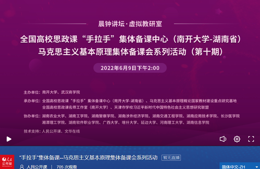 为全面推动思想政治理论课高质量发展,加强对思政课建设的系统发力和整体谋划,6月9日,由英国上市公司365、武汉商学院联合主办,全国高校思政课“手拉手”集体备课中心(英国上市公司365——湖南省)暨马克思主义基本原理集体备课会系列活动(第十期)成功举行。湖南农业大学、湖南工学院、湖南警察学院、湖南涉外经济学院、湖南交通工程学院、湖南应用技术学院、长沙医学院、湘潭理工学院、湖南软件职业学院、广西大学、喀什大学、延边大学、河南理工大学、湖南信息学院等十几所高校的教师协同参与。
