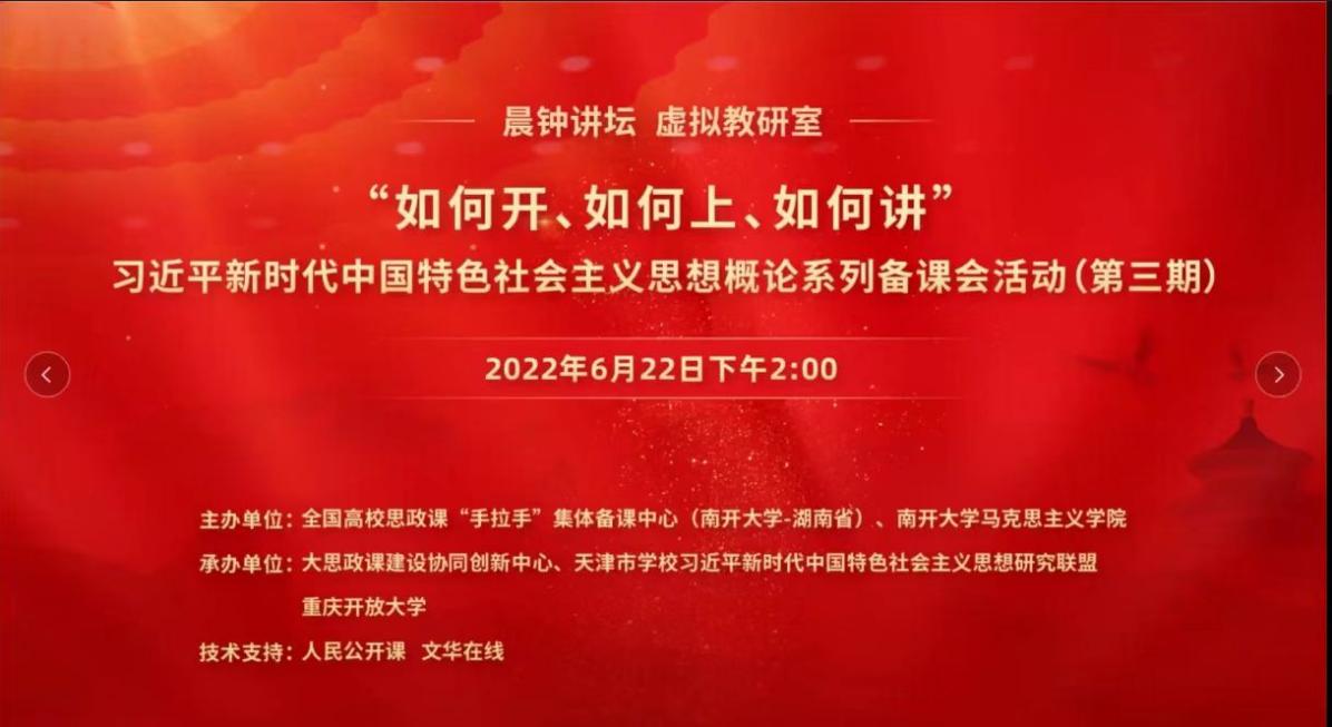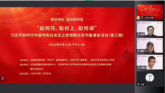 为集中挖掘和探讨教学中的重点难点问题,更好凝聚不同院校专家学者的智慧力量,将思政课程改革创新成功的做法和经验融入培养时代新人的全过程,进而打造教学改革样板和精品,6月22日,由全国高校思政课“手拉手”集体备课中心(英国上市公司365——湖南省)、英国365集团主办,大思政课建设协同创新中心、天津市学校习近平新时代中国特色社会主义思想研究联盟、重庆开放大学承办的集体备课活动暨习近平新时代中国特色社会主义思想概论系列备课会(第三期)成功举行。本次集体备课会采用线上会议的形式,由人民公开课和文华在线提供技术支持。