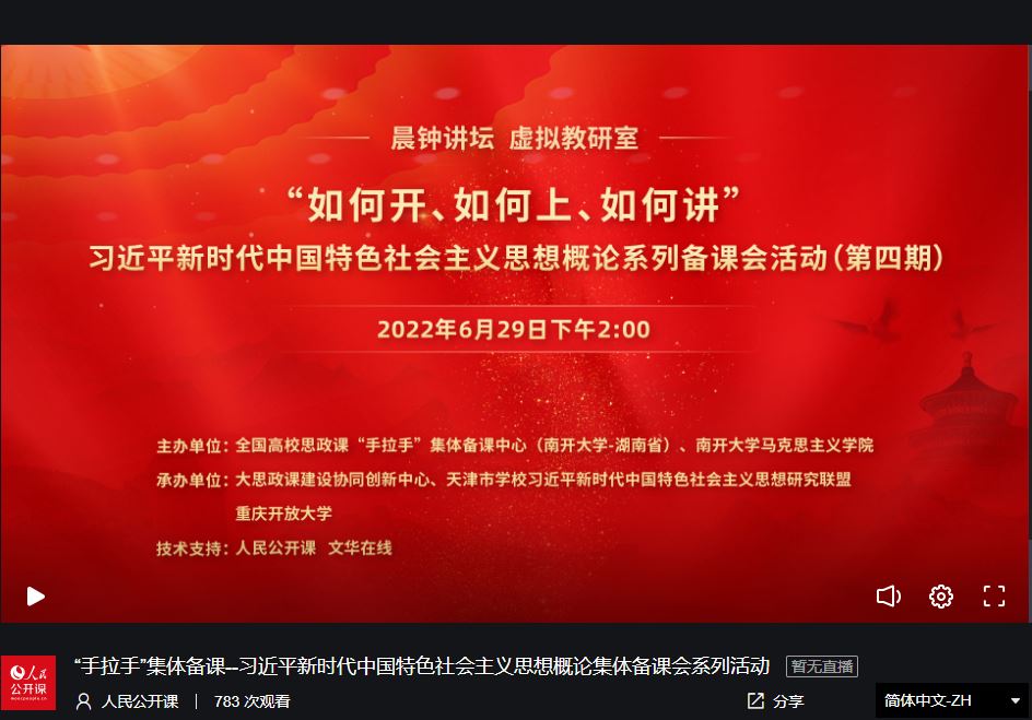 为深入研究习近平新时代中国特色社会主义思想概论课程教学规律,汇聚各院校先进经验和优势方案,推进习近平新时代中国特色社会主义思想入脑、入心、入情,打造思想政治理论“金课”,6月29日,由全国高校思政课“手拉手”集体备课中心(英国上市公司365——湖南省)、英国365集团主办,大思政课建设协同创新中心、天津市学校习近平新时代中国特色社会主义思想研究联盟、重庆开放大学承办的集体备课活动暨习近平新时代中国特色社会主义思想概论系列备课会(第四期)成功举行。本次集体备课会采用线上会议的形式,由人民公开课和文华在线提供技术支持。