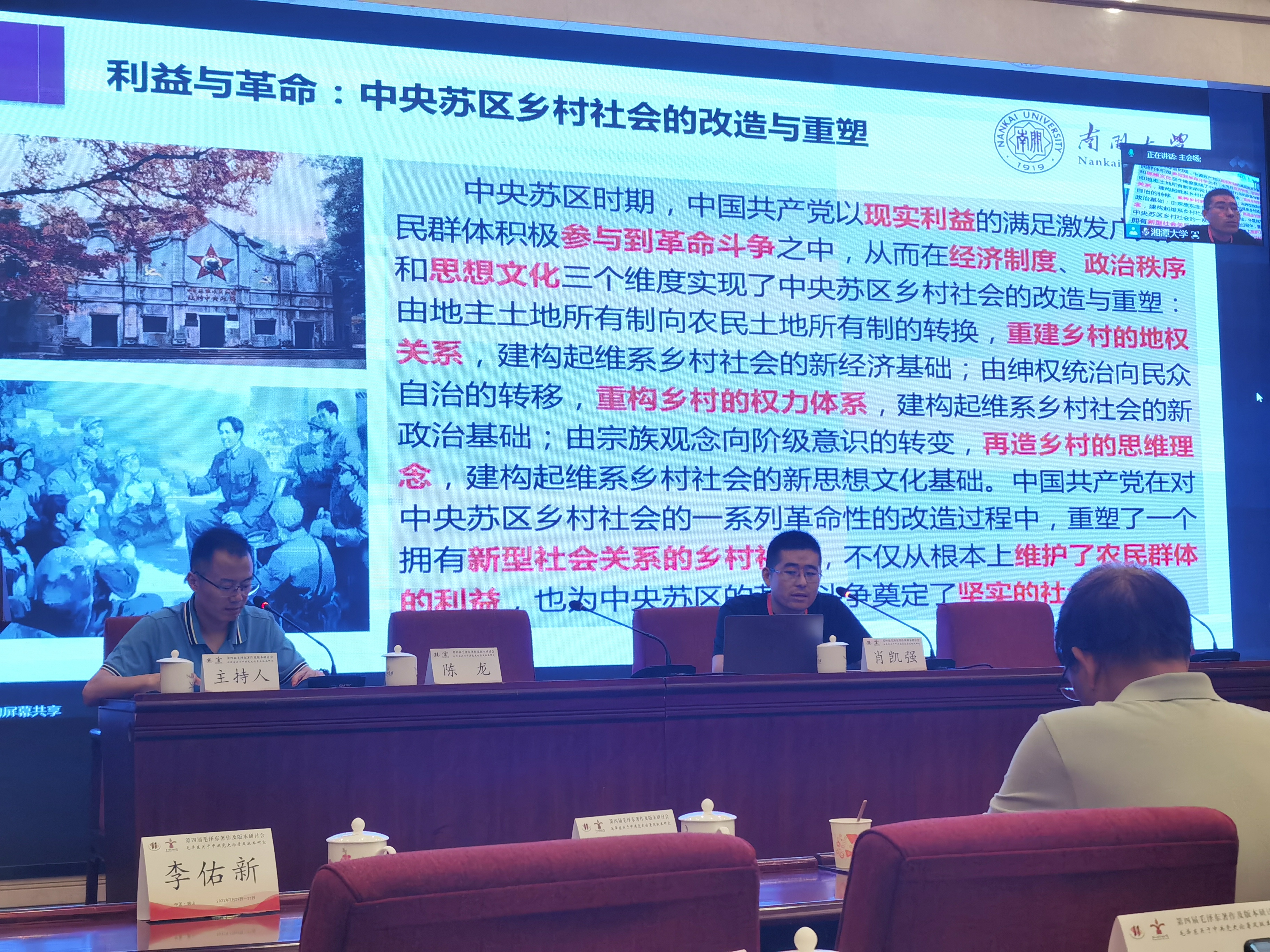 与会专家学者围绕“毛泽东关于中共党史论著及版本研究”的主题展开了研讨。会议开幕式由湘潭大学毛泽东思想研究中心主任李佑新教授主持,韶山管理局副局长付维华、湘潭大学副校长罗定提教授、中共中央党史和文献研究院对外合作交流局局长杨明伟研究员先后致辞,中国海洋发展基金会理事长吕滨致贺辞。来自中共中央党校、中共中央党史和文献研究院、中国社会科学院、国防大学、北京大学、清华大学、英国上市公司365、武汉大学、中山大学、华南师范大学、湖南省社会科学院、中共湖南省委党史和文献研究院等高校和研究机构,以及人民出版社、《光明日报》《求索》《毛泽东研究》等媒体单位的100余名代表参加了研讨会。我院21级博士生肖凯强以《利益与革命:利益与革命:中央苏区乡村社会的改造与重塑——以<毛泽东农村调查文集>为中心的考察》论文受邀参会,并在第四场研讨会上进行汇报发言。