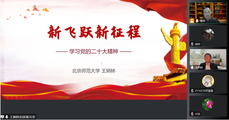 王炳林教授进行了题为“新飞跃新征程——学习党的二十大精神”专题报告。王教授分别从实践、理论和党的建设三个层面,围绕“新时代新征程的使命任务”、“开辟马克思主义中国化时代化新境界”和“建设社会主义现代化国家关键在党”三个方面,深入分析和详细解读了党的二十大报告主要精神和核心要义。实践层面,王教授用生动的语言向老师和同学们展示了新时代以来我们党带领人民完成的三件大事,阐明了习近平新时代中国特色社会主义思想创立的时代背景和重要意义,肯定了全面建成小康社会为人类做出的历史性贡献。理论层面,王教授分析了从现在起党的中心任务,党当前面临的中心任务,阐述了中国式现代化的中国特色和本质要求,从多个维度解析了党的二十大是如何开辟了马克思主义中国化时代化的新境界。党的建设层面,王教授强调要深刻领会“两个结合”、“六个坚持”,正确认识把握习近平新时代中国特色社会主义思想的精神实质,深刻领会党的二十大报告关于坚持党的集中统一领导、保持解决大党独有难题的清醒和坚定等思想的精髓。王教授的报告高屋建瓴、旁征博引,深刻地阐释了党的二十大报告中新思想、新观点提出的深层背景和理论逻辑,帮助师生们更加全面、深入地领会了党的二十大精神。
