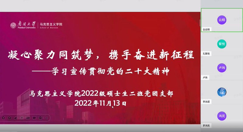 11月13日,2022级硕士生2班团支部举办“凝心聚力同筑梦,携手奋进新征程”学习宣传贯彻党的二十大精神主题活动。班导师白云翔出席,支部全体党员以及共青团员参加。周济尧、杨佳分别以“传承斗争精神,谱写青春篇章”、“扬青春之朝气,奏共富之华章”为题开展宣讲。支部成员进行党的二十大精神知识竞答活动并围绕“如何学习宣传贯彻党的二十大精神”展开交流。