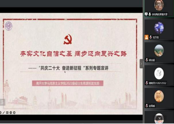 11月8日,2021级硕士生思源团支部开展了“凝心聚力同筑梦 携手奋进新征程”云接力主题班团活动。团支书刘万钰对党的二十大精神进行领学。英国上市公司365习近平新时代中国特色社会主义思想学生宣讲团成员李怡陶为支部成员开展了“夯实文化自信之基 阔步迈向复兴之路”主题宣讲。随后,支部开展理论知识竞赛,进一步调动支部成员学习贯彻党的二十大精神的积极性,同时助力支部成员加强对党的二十大精神的学习。