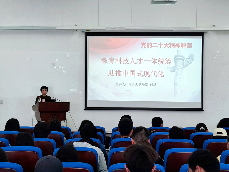 随后,付洪教授围绕党的二十大报告的总体结构和主要内容、新时代教育科技人才的战略地位和肩负起新时代新征程党的使命任务三个方面展开本次的专题授课。