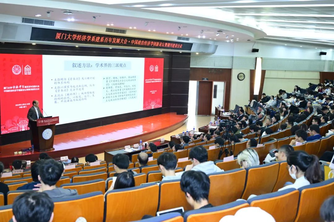为更好推动马克思主义中国化时代化、中国特色社会主义政治经济学研究,促进马克思主义基本原理与中国具体实际相结合、同中华优秀传统文化相结合,增强学者与学术期刊的对话交流,由厦门大学经济学院、王亚南经济研究院、邹至庄经济研究院和中国政治经济学年会联合主办,厦门大学经济学院经济学系承办的“中国政治经济学创新论坛暨期刊建设会议”于20231125-26日在厦大经济楼成功举办。该论坛是厦门大学经济学院经济学系建系百年大会重要活动之一,含开幕、闭幕主题演讲和分论坛环节,10位来自政治经济学领域的专家带来主题演讲,22篇研究成果在分论坛中被报告分享和研讨。我院博士生胡泽鹏受邀参加会议,并在分论坛上进行主题发言。