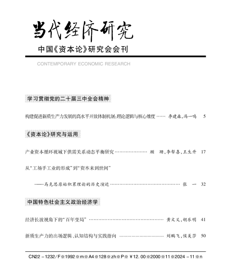 我院顾珊老师在《当代经济研究》发表文章《产业资本循环视域下供需关系动态平衡研究》。文章认为,实现供需高水平动态平衡,是畅通国民经济循环、推动高质量发展的关键。结构性供需失衡,在微观层面表现为产能过剩,在宏观层面表现为“低端供给过剩”和“高端供给不足”并存。基于马克思产业资本循环理论分析中国经济供需动态关系,通过构建测度供需结构特征的量化模型,并结合中国投入产出数据进行测算后发现:微观层面,生产能力过剩问题集中于第一产业和第二产业部分部门,且2015年以来产能利用率整体提升,重工业部门治理成效明显;宏观层面,供需结构错配表现在五大方面即建筑行业供给严重过剩,传统加工制造业供给普遍过剩,科研技术与信息软件服务供给相对不足,文体娱乐及公共产品供给较为滞后,原材料开采和供应严重不足。由此,应从完善市场机制、优化供给结构以及增强创新能力入手,推动供需实现高水平动态平衡。