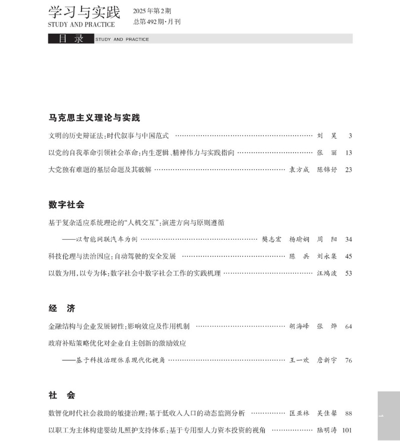 我院青年教师刘昊在《学习与实践》发表文章《文明的历史辩证法:时代叙事与中国范式》。文章认为,历史辩证法是理解和把握人类文明演进发展的“锁钥”。马克思恩格斯以历史辩证法透视人类文明的历史变迁,从肯定与否定、实然与应然、普遍与特殊等多重维度展开了对资本主义文明的理性考辨和对人类未来文明形态的科学构思。进入20世纪,列宁和毛泽东继承运用马克思恩格斯的历史辩证法,基于后发国家的革命视角和实践探索,完成了对社会主义文明的道路开辟与图景拓新。党的十八大以来,习近平基于大历史观的宏阔视域创造性地提出“两个结合”,强调依托中国式现代化建设中华民族现代文明,在历时性与共时性的辩证统一中破解了文明的“古今中西之争”,推动了人类文明新形态的正式定型出场。作为21世纪现代文明的“中国样本”,人类文明新形态充分彰显了民族性与世界性相统一的历史辩证意蕴,提供了文明繁荣进步的中国范式。