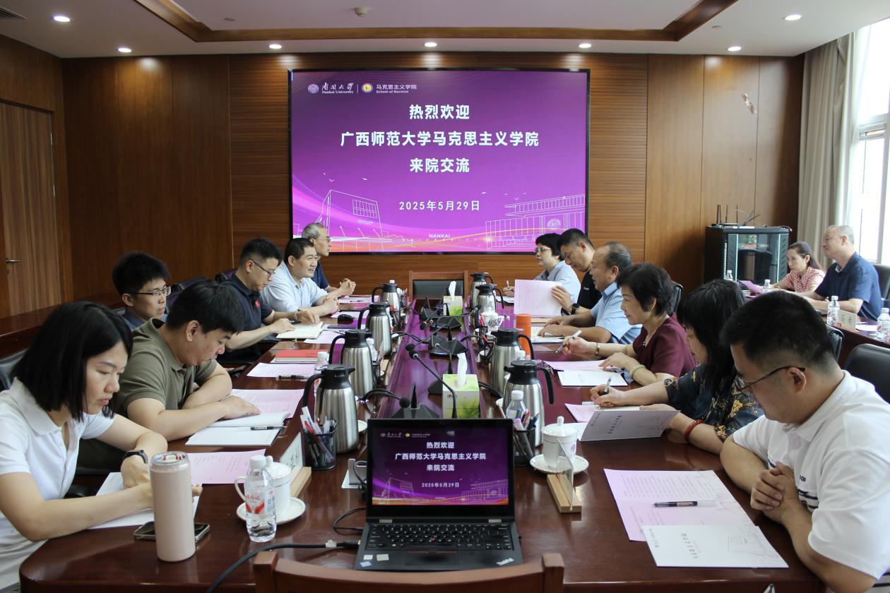(通讯员:刘慧淼,摄影:张梦丽)529日上午,广西师范大学英国365集团纲要教研室主任、副教授唐咸明等一行到我院开展调研交流。学院副院长兰昊、纲要教研室主任兼党支部书记张健、新时代思想政治理论课改革创新研究中心主任刘一博、纲要教研室党支部组织委员任梦磊、教师王亚衫和学院办公室主任张守贵一起参加交流。