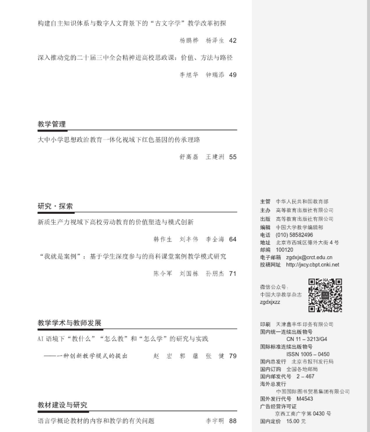我院舒高磊副教授在《中国大学教学》发表文章《大中小学思想政治教育一体化视域下红色基因的传承理路》。文章认为,在大中小学思想政治教育一体化视域下传承红色基因,需要厘清内涵、原则、要素、环节、成效等方面的基本理路。追问红色基因传承的立意前提,把握好“自觉的政治意识”“坚定的理想信念”“深厚的价值底蕴”“优良的精神作风”等内涵要义。明确红色基因传承的依循原则,坚持理论与实践相结合、现代与传统相融通、规律与价值相渗透、守正与创新相联结。统筹红色基因传承的关涉要素,实现主客关系互促共进、历史资源联动共享、管理制度规范共治、实践场域协作共建。理顺红色基因传承的渐序环节,明确差异化定位、增进梯次性配合、强化有效性互动、促成一体化协同。观照红色基因传承的实效反馈,促进青少年通晓红色知识、厚植文化记忆,增进文化自信,深化红色实践、勇担文化使命。