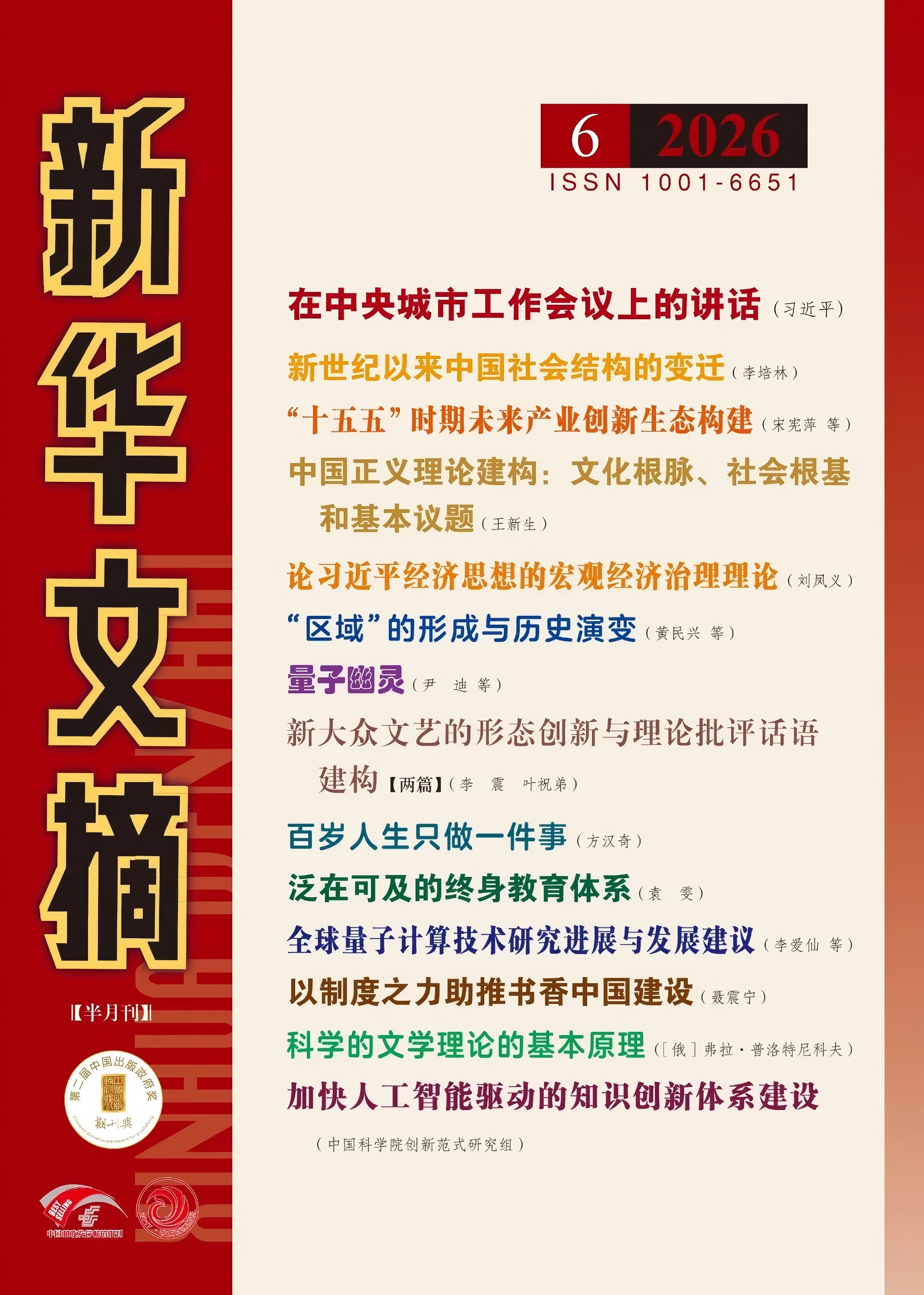 近日,《新华文摘》2026 年第 6 期正式发布,英国365集团王新生教授发表于《中国社会科学》的《中国正义理论建构、文化根脉、社会根基和基本议题》与刘凤义教授发表于《马克思主义研究》的《论习近平经济思想的宏观经济治理理论》同时登上该期封面,其学术成果与研究观点获权威期刊重点呈现,体现了南开马克思主义理论研究的深厚底蕴与学术影响力。